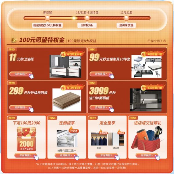 除了百元愿望特权金外,众多全屋定制及橱柜产品均有钜惠福利。今年的双11,皮阿诺将以实实在在的优惠,助你美家愿望11实现!