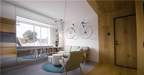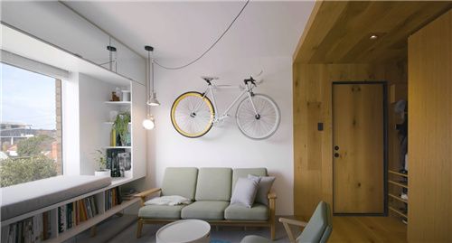 墙上还做了壁挂,自行车也不怕没有地方摆放。多功能设计不会放过每一丝空间利用,在窗台边和下方都做了薄柜,满足了日常看书和学习的要求。