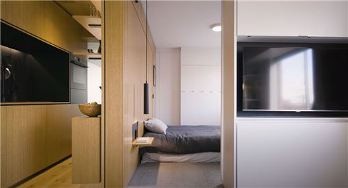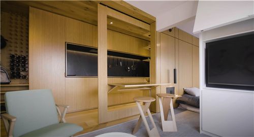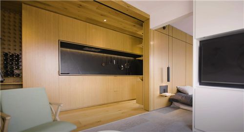 纵观空间:客厅、厨房、卧室都是相邻的区域。餐桌整面墙是可推拉+可局部翻折的设计,收起来可以给客厅和厨房做区域的划分,放下来就是餐桌,用餐完毕收进去,也不会影响日常通行。