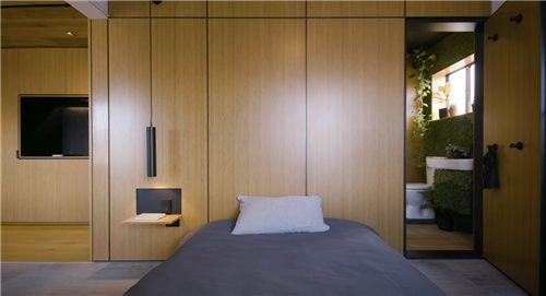 空间设计力求整体与简洁,衣柜上还做了小块面的翻折柜,代替传统的床头柜放置小物品就足够。