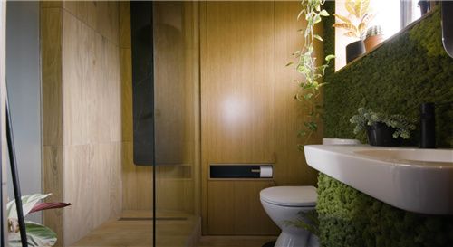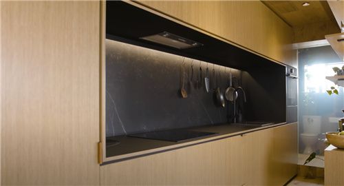 值得一提的是,卫生间采用了电控型的调光玻璃,平常能够保证厨房的基本采光,在需要使用卫生间时,也充分保证了卫生间私密性。