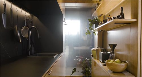 漆黑的背景墙在灯光的映衬下,显得深沉、冷静。双面收纳柜、置物架的组合设计,是空间高度利用思维的体现。注重与自然风格的结合和质感,原木材质、几株垂吊的绿萝体现对生活格调的追求。