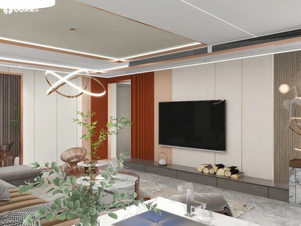 客餐厅运用木饰面和线型灯带、以及恰到好处的留白,耐看、优雅的色调辅以灰棕叠底。拼色的电视墙丰富空间的层次与深度。