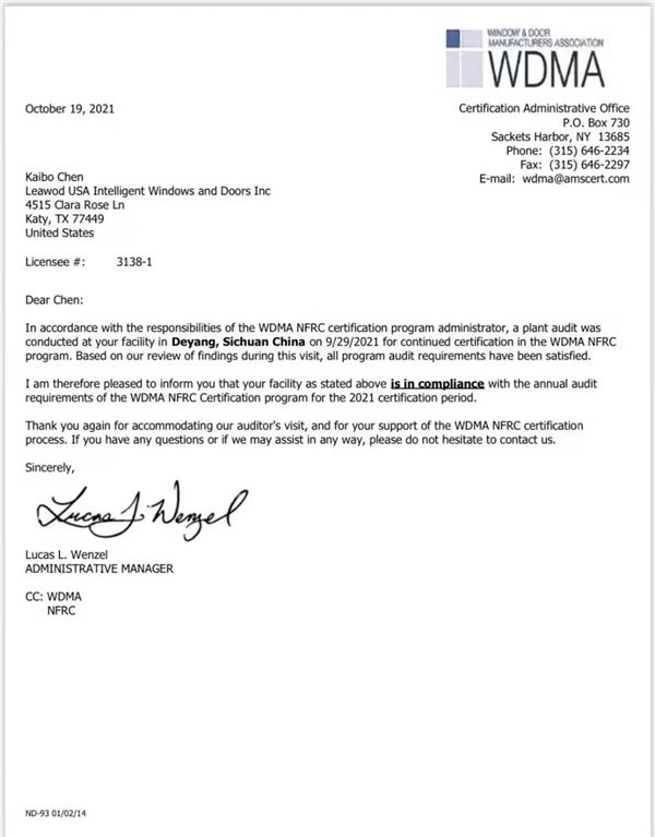 良木道美国公司获得NFRC国际门窗认证