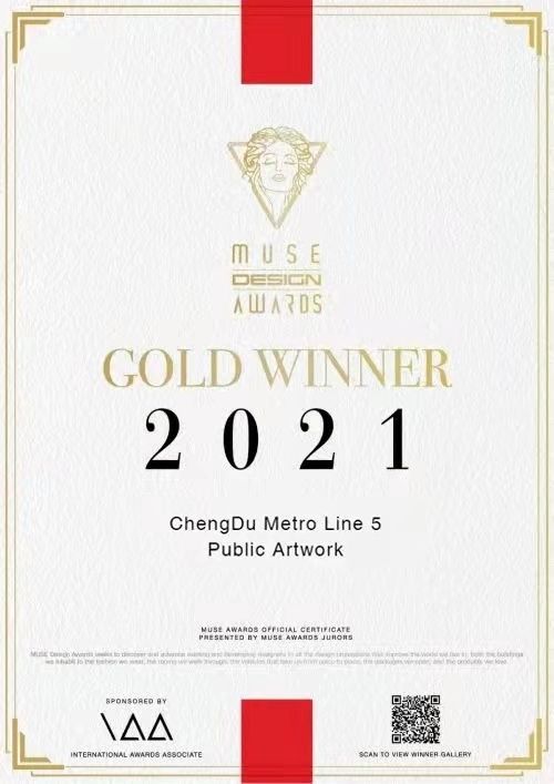 在其公布的2021年第二季全球获奖榜单中,成都地铁5号线公共艺术系列作品,从全球各国和地区众多优秀参赛作品中脱颖而出,荣获室内设计类别金奖!