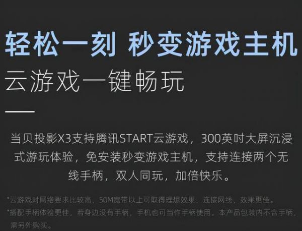 当贝X3激光投影仪与华为合作,通过华为CAST+投屏协议,彻底实现移动小屏手机和家用大屏投影仪跨屏互联,大屏体验更顺畅更刺激;更与腾讯START云游戏合作推出云游戏专区,玩游戏再也不用下载,直接在线玩,《原神》、《QQ飞车》、《胡闹厨房》等等经典受众广的游戏通通有;