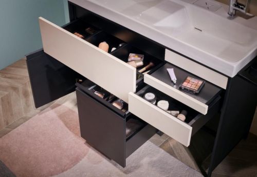 科勒博纳2.0浴室柜细心划分多种灵活分区和储物配件,更贴心配备弹拉小抽板方便物件取拿,充分利用空间的每一方寸。一体式台盆后置落水的设计便于使用者清理台面,打理柜内收纳空间,在快节奏的生活中留出属于自我的放松时刻,享受极致家居体验。