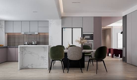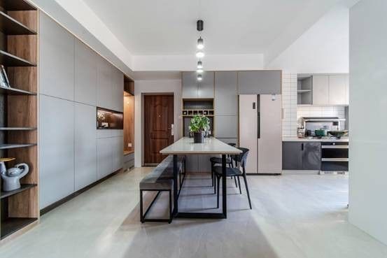 每当我们看欧美电视的时候,很羡慕他们在做饭的时候还可以跟别人自由的互动聊天,这就是开放式厨房的优势。开放式厨房将餐厅与厨房紧密相连,所以空间上会更具有连贯性,风格整体感更强,并且在装修上少了些隔断,更加省钱。而且开放式厨房提高了空间利用率,让室内变得更加通透、明亮,而且缩短了生活动线,取用物品更加方便,同时可关注到客厅、餐厅,方便有孩子的人随时照看孩子或者与家人交流互动,给人以自由、开放的感受,让做饭不再是一个人的"战场。