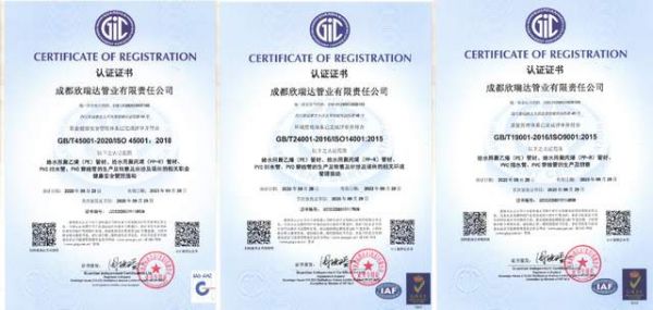 在产品的质量把控上,欣瑞达力求精准。每一个环节,每一个流程,每一个产品都严格遵循高标准、高要求。旗下所有产品均严格按照GB-T18742-2002《冷热水用聚丙烯(PP-R)管材》、GB/T13663-2000《给水用聚乙烯(PE)管材》等国标生产,更甚至,还委托四川省产品质量监督检验所定点检验合格,十分具有权威性、真实性。正是因为对质量的严格把控,让它荣获了PE质量管理体系、中国绿色环保产品等多项证书。