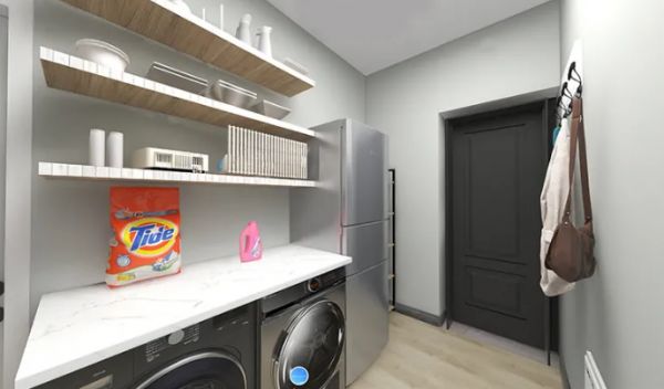 从平面图中可以发现,此户型的门厅面积比厨房都要大,而卫生间的面积则相对较小。基于业主充分利用空间的需求,该空间被设计为厨卫的补充区域,承担起洗衣机、烘干机、电冰箱的“收纳”任务,直接带给了其他空间更强的可操作性。