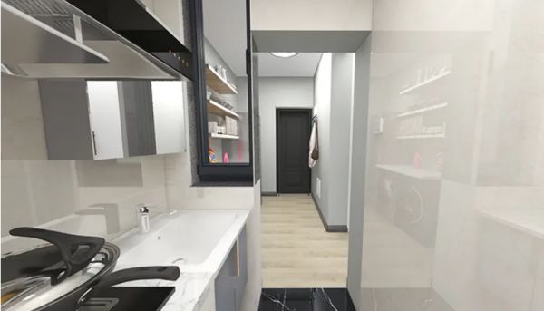 厨房小巧而精致,上下组合柜突出功能性,保证将居家柴米油盐酱醋茶以及一应烹饪工具打理的井井有条,整洁的厨房也是为生活带来满足感的必要条件。