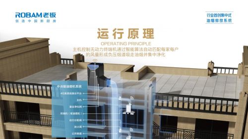 老板电器中央吸油烟机CCS由云平台、动力分配阀、主机、防火阀、终端机五大部分构成,将住宅建筑排烟系统视作一个整体,从全局出发考虑排烟设计,其运用物联网技术,将整栋楼的厨房终端机和楼顶的主机相连,通过动力调配匹配中国厨房猛火爆炒的烹饪习惯,吸走烹饪油烟。
