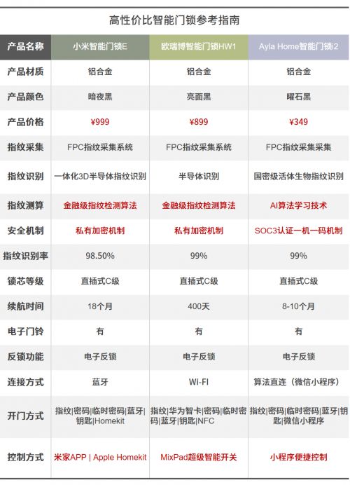 这次,我们着重盘点三款功能相差无几的智能门锁产品,分别是小米智能门锁E、欧瑞博智能门锁HW1、艾拉物联Ayla Home智能门锁i2,将从性能、品质、价格等各个方面进行多方比对,一较高下。