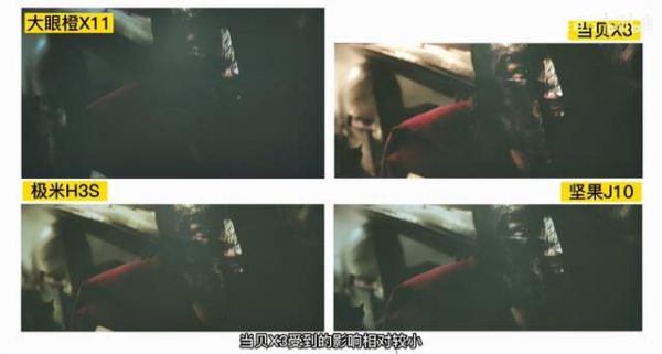 极米H3S的亮度只有2200ANSI流明,这个亮度虽然在晚上也能有不错的表现,但是在白天去看,画面的表现就会变差。就个人认为,当贝X3之所以获得成功,高亮度是最直接的原因,并且激光光源本身色彩还原度较高,观影的体验的确是要比其他投影仪要好上不少,下图就是一个博主做得对比,可以看到当贝X3在开灯情况下,能实现更高的亮度,表现出更多的细节。