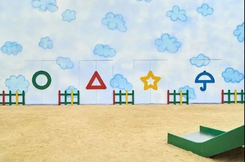 蓝天、白云,简单的符号,色彩鲜艳,这样的布景常常出现在游乐场或幼儿园里,适合小孩子,温馨又可爱。