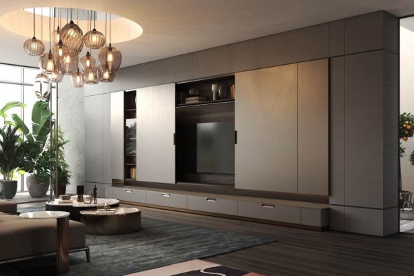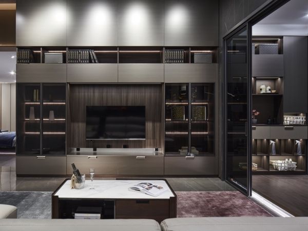 “星辰”系列在门型设计上一改传统的直线、直角样式,而是大量采用斜面、斜角的几何构造手法,不但使整个产品的层次感更为丰富,还能传递出不拘一格、尽情释放的自由理念。而在客厅电视柜设计上,还借鉴了数码产品的窄边框与无边框设计,再加上镀膜玻璃门采用无框门铰,简约大气又提供了空间利用率的同时,也让整个产品更具科技色彩。