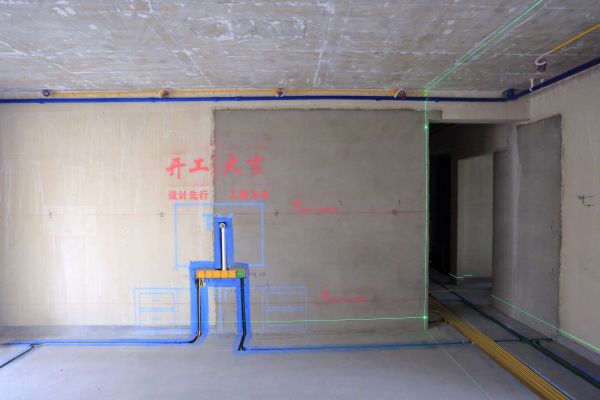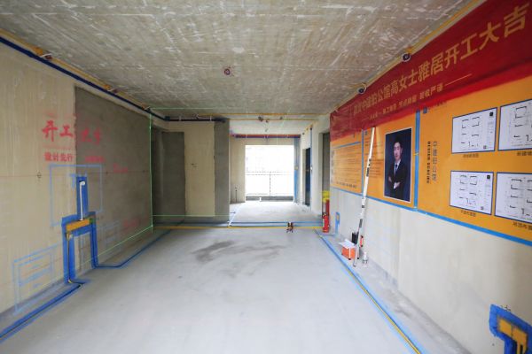 该项目水电已走完,所有线体整洁而有序地展现在巡访者的眼前,不仅如此,在每个空间的墙上,都标记了各类陈列家具和物品的位置、尺寸等详细信息,整体看起来一目了然,对施工者来说施工的时候也能有条不紊,可见,山水人家每一处细节的打造都源自于匠心。