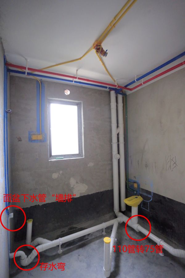 【▲卫浴间施工细节多】山水人家在卫浴间施工方面明地漏和暗地漏相结合,让明水从明地漏出去,经过长期使用瓷砖下沉时产生的水分都从暗地漏出去。每个地漏处都用“存水弯”做了“防臭”措施,且马桶下水管用110管转75管时,和一般装饰公司不同的是,山水人家将75管口置于转接口上方,以防止马桶冲水时影响地漏,导致“反臭”现象。此外,面盆的管道强制“墙排”,将下水管道嵌入墙壁内,如此一来浴室柜下方就不存在管道了,不仅美观,也方便清洁以避免卫生死角。