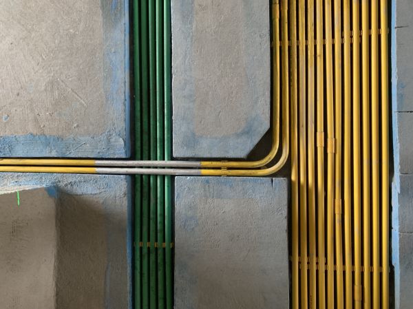 【▲水管全部走吊顶方便检修】山水人家装饰全房冷热水管全部采用德国海未原装进口PPR材质6分管,因为热水管的品质比冷水管的品质更高一筹,所以山水人家不吝成本将冷热水管统一采用热水管。工地的水管只有水阀处的水管是走的地面,其他全部走吊顶,以方便业主后期检修,每隔60厘米左右会用吊码来固定管路,以防止水流的情况下产生震动,而且所有的水管都进行了保温处理,以避免热损失。