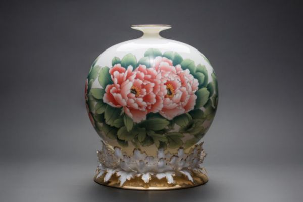 2017厦门金砖五国峰会上元首国礼《富贵五福》的设计灵感就是牡丹。牡丹是中国的国花,有富贵吉祥的美好寓意。整件作品以球体为主体,利用陶瓷瓶天方地圆的造型,使用五朵“不分彼此,不分大小”的牡丹花环绕球瓶满圈一周,让人站在任何一个角度看,都是一个完整的画面,象征“和谐共融,互惠互利”。值得一提的是,这件在装饰手法上首创釉上高温装饰,是一次创新和突破,也是国礼中少有的陶瓷绘画作品。