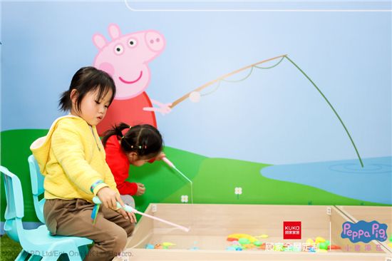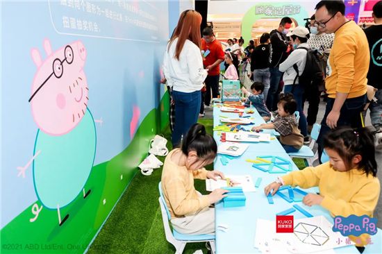 展馆现场人气爆棚,也不乏小朋友活泼快乐的身影。活动现场设有多个游戏互动区,现场的小朋友可以和乔治一起跳泥坑,感受没有污渍的快乐;也可以模仿猪爸爸造新家,动手动脑用积木“造”出一个向往的家;还可以和佩奇一起趣钓鱼,套住猪妈妈百宝箱里的收藏。