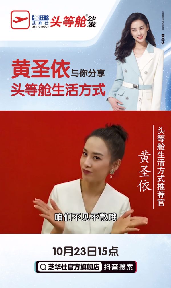 距黄圣依坐客芝华仕抖音官方直播间还有一天!锁定芝华仕抖音官方直播间,和黄圣依一起体验芝华仕专属的“头等舱的生活方式”!