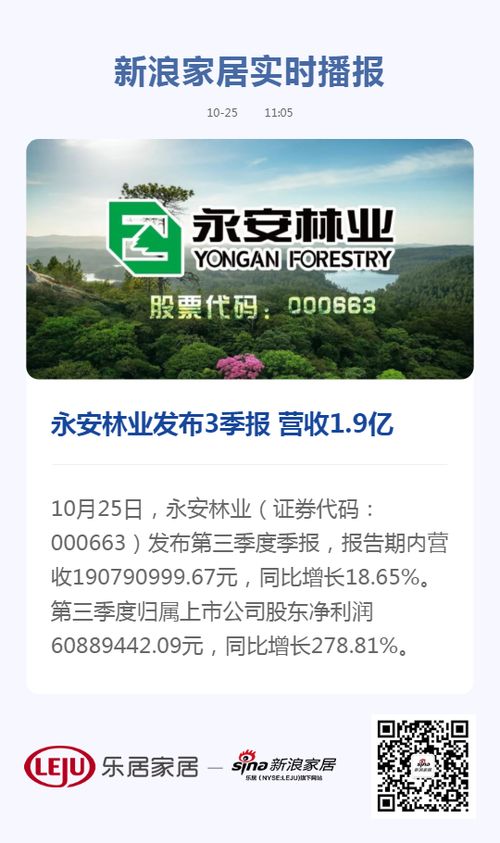 10月25日,永安林业(证券代码:000663)发布第三季度季报,报告期内营收190790999.67元,同比增长18.65%。第三季度归属上市公司股东净利润60889442.09元,同比增长278.81%。