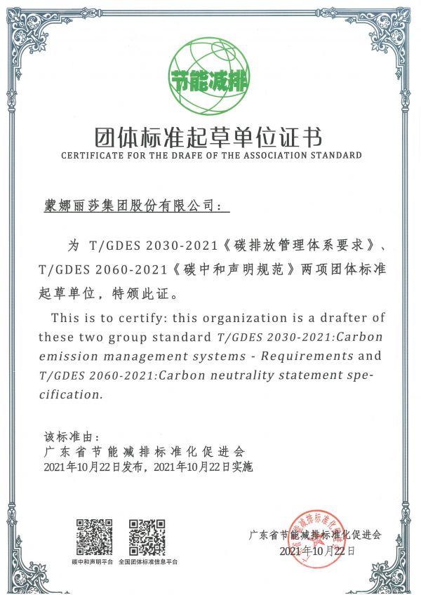 会上,《碳排放管理体系要求》T/GDES 2030-2021和《碳中和声明规范》T/GDES 2060-2021两项重要引领标准正式发布,其中蒙娜丽莎为团体标准起草单位之一获颁证书。该标准是由广东省节能减排标准化促进会执行会长刘华教授研究团队联合20多家企事业单位,研制和发布的,顺应了“碳达峰”、“碳中和”的国家战略目标,并为企业开展数字化转型实现高质量绿色发展提供了重要的引领作用。