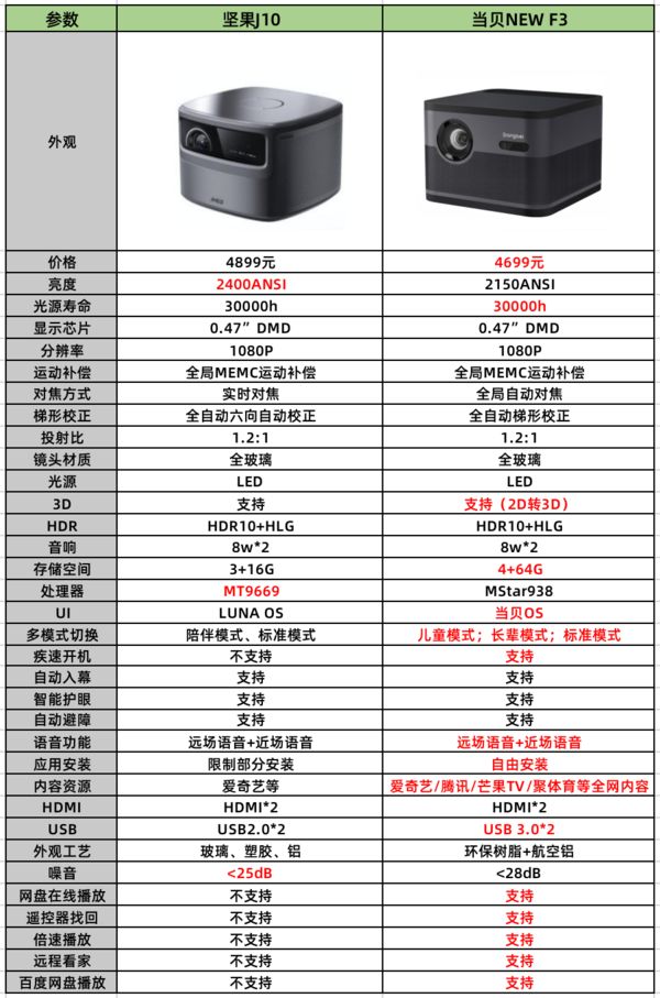 今天小编就从下面这些方面来和大家说说当贝NEW F3和坚果J10。了解一样食物当然就要从最基础的开始了解,参数对比表是测评这两款投影仪的标准之一。