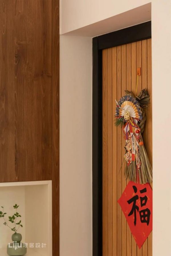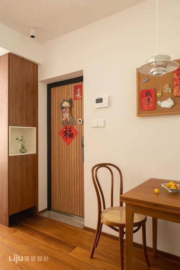 这个是打开房门后的视角,对面是一面白墙,为提高利用率,就定制了一组底部悬空的半高柜,加上红底黑字的“吉祥如意”装饰画,让人一回家就能种满满的仪式感。
