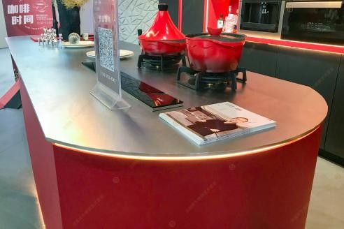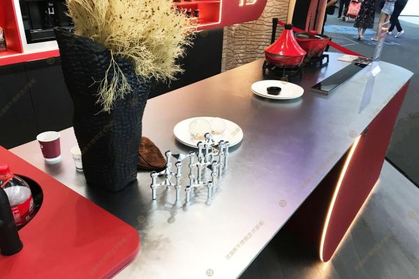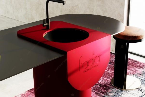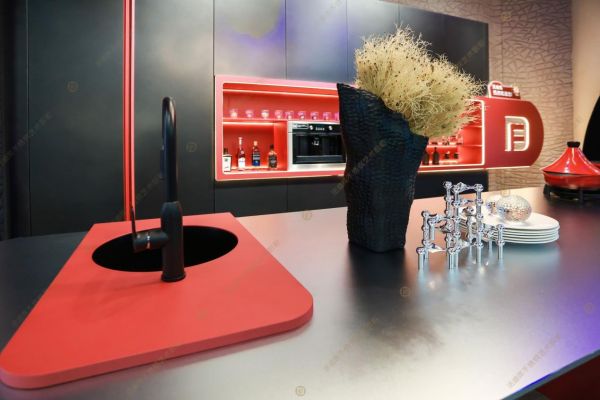 搭配超薄实心不锈钢台面,红色圆弧水槽裙,稳重中透出轻盈和冷锐。
