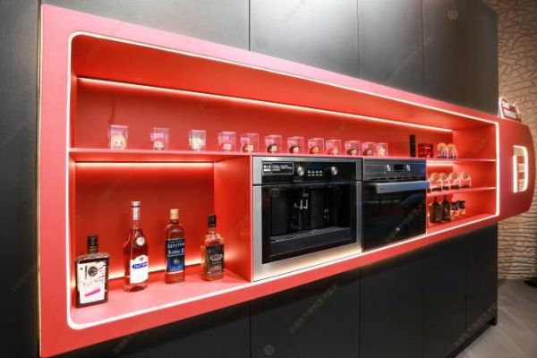 不锈钢橱柜搭配暖色灯光,更好的彰显产品的陈列属性,如同酒吧般炫丽。
