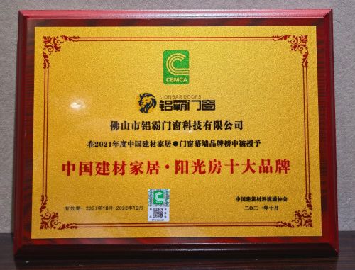 (铝霸门窗获得“中国建材家居●阳光房十大品牌”)