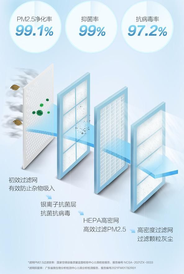 在空气净化方面,TCL卧室新风空调通过搭载初效过滤网、银离子抗菌层、HEAP高密滤网、高密度滤网组成的4层滤网净化系统,PM2.5去除率达99.1%,抑菌率达99%,抗病毒率达97.2%,如花粉、PM2.5等空气中常见的污染物基本上都能清除,让人们住在新房子里也能畅快呼吸。