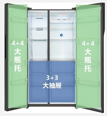 此外,冰箱的内部空间还经过了精细的划分,在超大容积的基础之上,采用了4+4共计8个瓶托区,和冷冻区3+3共计6个冷冻抽屉,再加上6个隔板区域,共计20个精细的分区存储空间,使得蔬果、禽肉、水产、酒水、干货等等食材都有特定的存放区域,不但能实现冰箱内部空间的高效利用,还能让各种不同食材可以井井有条的存放在应该在的位置,任何食材的放置、存取都便捷明了。