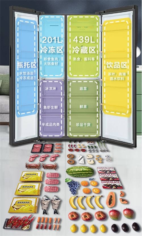 TCL时鲜系列冰箱R640P8-S有着640L的超大容积,其中冷藏室439L,冷冻室201升,足以放下超多食材。