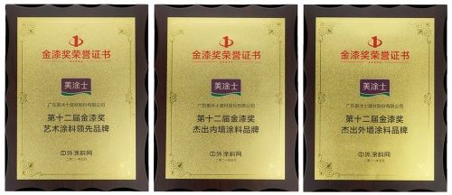 在第十二届金漆奖盛典上,美涂士在500多家涂企中再次脱颖而出,凭借自身的品牌实力与行业公信力荣获了“第十二届金漆奖艺术涂料领先品牌”、“第十二届金漆奖杰出内墙涂料品牌” 、“第十二届金漆奖外墙涂料品牌”三项荣誉,用实力彰显了美涂士在涂料领域的品牌影响力。