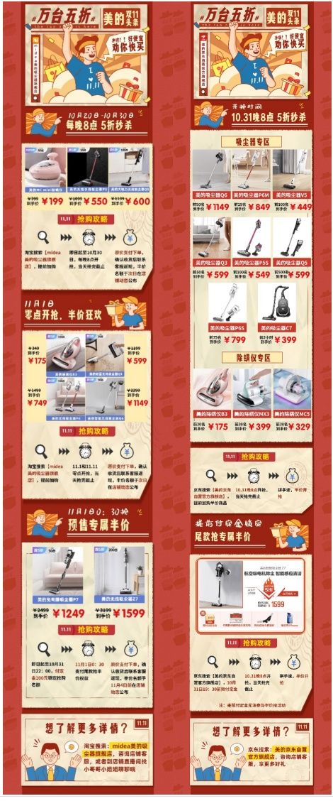 超高性价比,更多爆款产品,不止5折,更有精美礼品相送!10月20日-10月30日,天猫midea美的吸尘器旗舰店开始第一波大促。自10月31日起,京东与天猫平台多平台强势袭来,开启半价狂欢。“傻瓜式”薅羊毛,小编都为你整理好了: