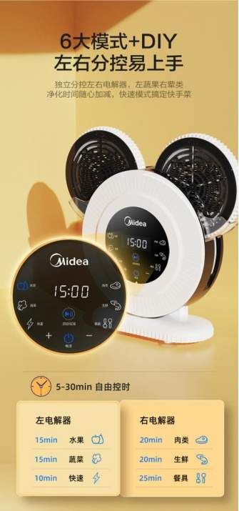 美的MQ2双驱食材净化机采用分体设计,独立分控左右电解器,左蔬菜水果右肉类海鲜,6大模式全方位覆盖你的清洗需求。净化时间随心加减,5-30min任意选择,无论你是时间紧张的上班族,还是周末居家准备大餐的生活家,都能根据需求和任务安排自由调节时间。