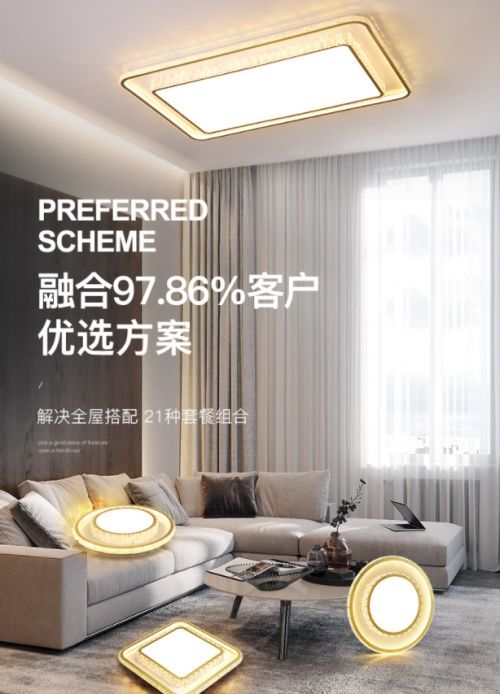 而全屋套餐和卧室套餐除了更直观的性价比优势之外,更能保持家居家装的整体而统一的设计风格。全屋套餐包含吸顶灯,回形或圆形灯身简约白带、均匀布光,边框镶嵌精致的双层水晶玻璃,实现光线的多角度折射,璀璨又梦幻。