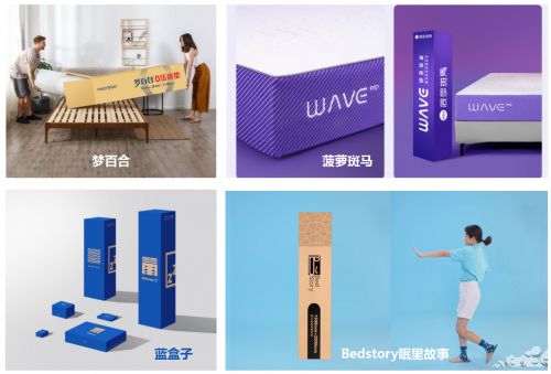 四款均采用盒子包装形式,简洁大气,菠萝斑马和蓝盒子分别以紫色和蓝色夺人眼球,梦百合则偏沉稳,眠里故事包装上则以英文为主,浓浓的国际化气息。