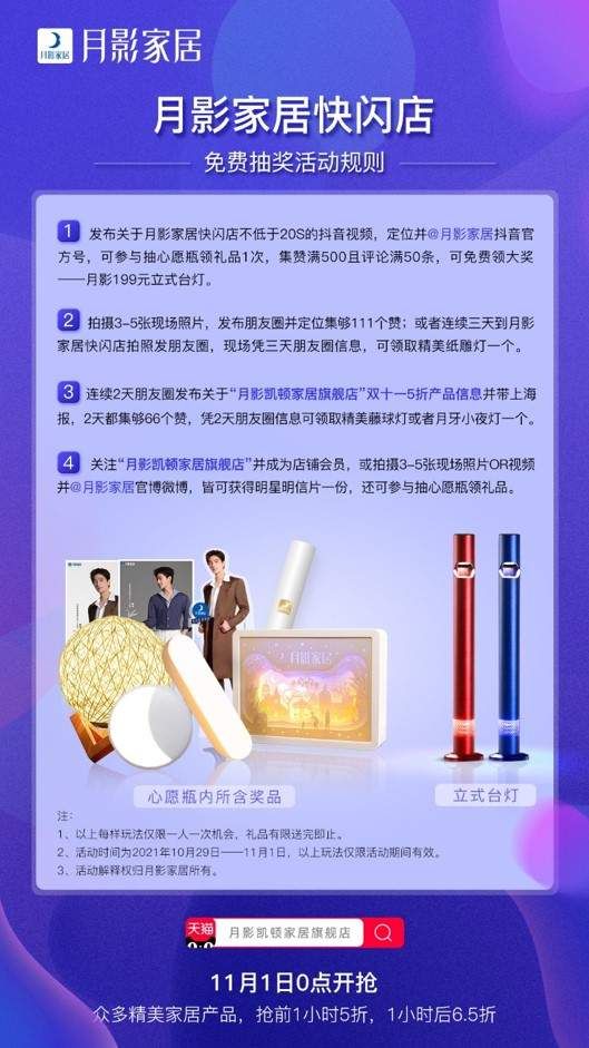 线下快闪店活动期间,现场参与打卡即可参与免费抽奖,代言人杨洋惊喜周边、月影时尚可移动立式台灯、精美纸雕灯、藤球灯以及月牙小夜灯等超多精美礼品等你来拿。