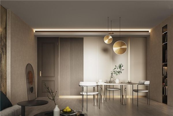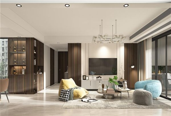 突破独立格局的限制,门、墙、柜作为一个家居生态系统,视觉统一,乌金橡木作为门墙柜主体统一颜色,在轻奢基调中,给了这套空间更顺畅的动线延伸,满足年轻人美好的生活想象。