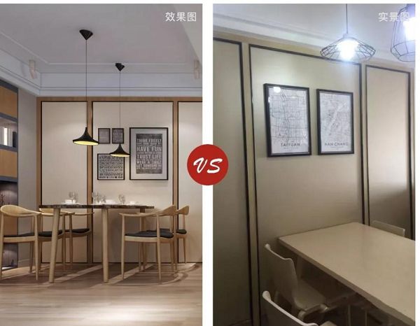 效果图是设计师通过电脑制图生成,能很好调配色彩和光影,但现实中很难做到百分百复原,搭配不当会形成相当突兀的画面。