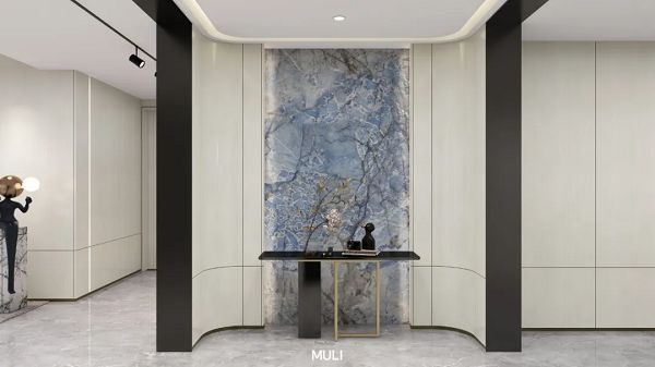“胡桃木外观高贵大气,木纹精巧、别致、清晰,应用于家中尽显优雅大方。因此我们将原本壁布的公区墙面,更换为了胡桃木饰面,想给业主带来不一样的感觉。”设计师介绍道。