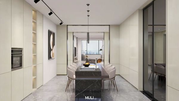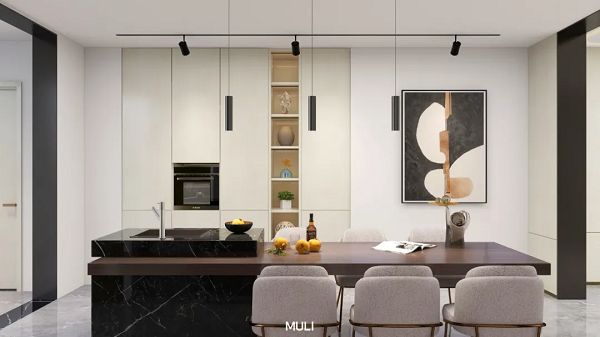 从客厅到餐厅,大量运用纵深排布的极简线条元素,缔造出丰富的空间层次。落地的木饰面橱柜,给空间增添了一份沉稳。餐厅与厨房之间,通过黑色金属边框的灰色玻璃门隔断,使餐厅区域的格调得到显著提升。