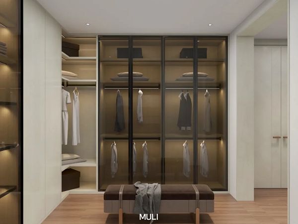 视线拉到衣帽间,整体布局同样呈现简约的调性。衣柜柜门采用茶色玻璃设计,为整个空间带来高级感和灵动性。