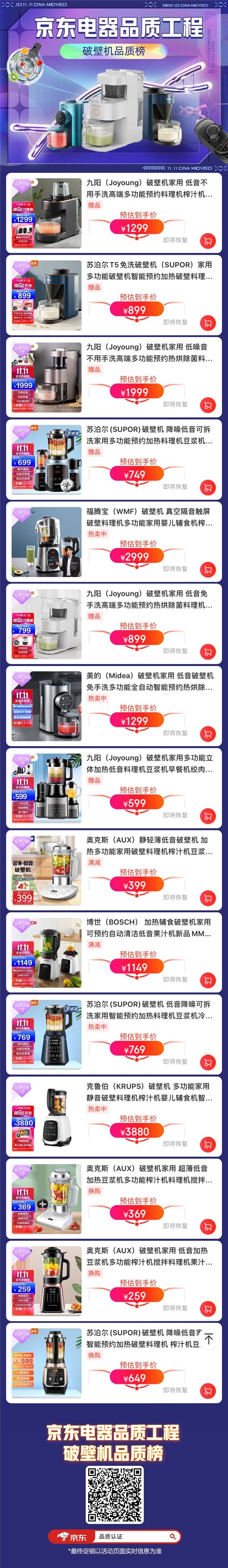 京东电器品质工程破壁机品质榜上线,九阳、美的、苏泊尔等产品获“品质认证”