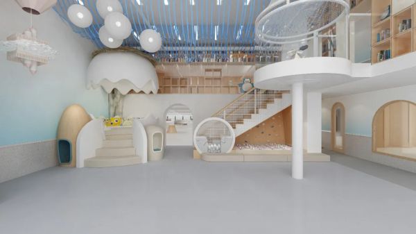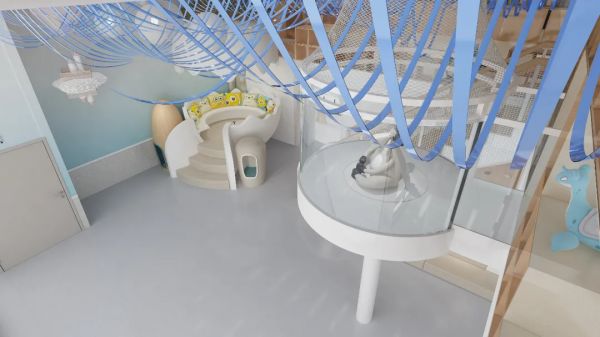 孩子的主要活动区域以“初生”为主题,意味纯真无邪的纯白与浅蓝相映,犹似刚刚破壳而出的新生命,对身边的一切充满未知,需要一个更为宽阔的舞台探索新的世界。