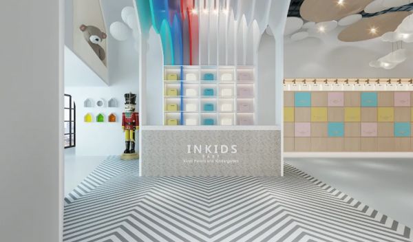 摒弃传统幼儿空间进门就是花花绿绿,项目设计上以相近的白色与彩色为主,用简单朴实的设计向孩子们展示出世界的缤纷。错落有致的色块搭配,充满艺术感的创意造型,不同图案的组合与堆叠完成了独特而具想象力的空间建构,孩子的创意思维瞬间被激发。
